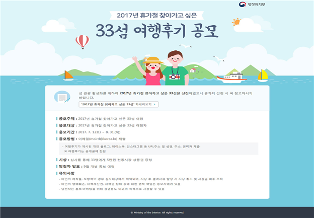 한편 행정자치부는 여행 후기 블로그 공모전을 개최한다. 26일부터 8월 31일 사이에 33섬중 하나의 섬을 방문해서 개인 블로그 등 SNS에 후기를 올린 33인을 선정해 기념품을 지급한다.