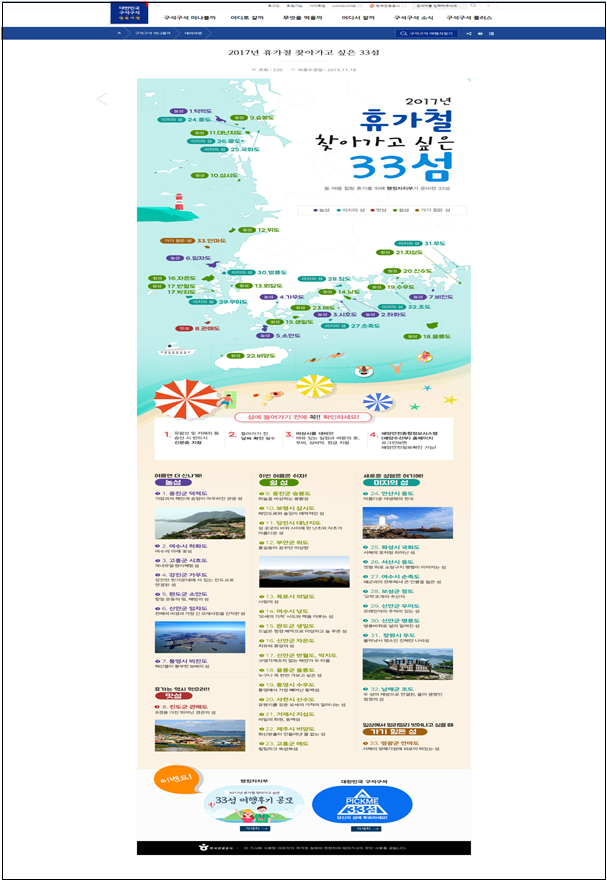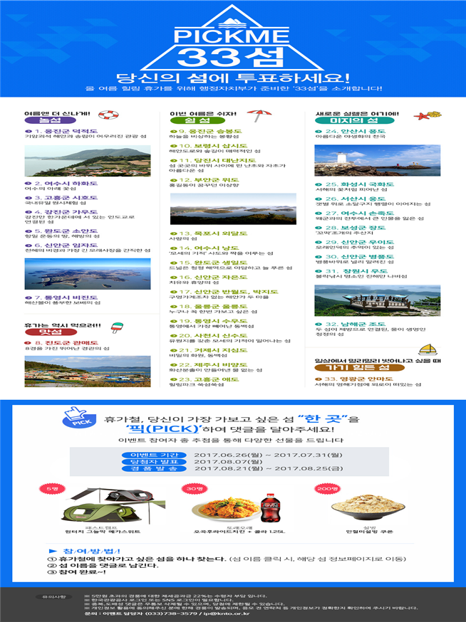 한국관광공사는 ‘대한민국 구석구석’ 홈페이지 내에 ‘2017년 휴가철 찾아가고 싶은 33섬’ 코너를 개설 운영한다.