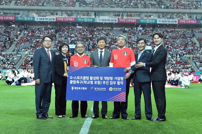 [로컬세계 고기훈 기자]경기도의회(의장 송한준)와 경기도교육청, 대한축구협회가 11일 오후 서울 상암 월드컵경기장에서 경기도형 스포츠클럽인 ‘G-스포츠클럽’ 활성화를 위해 공동 노력하자는 내용의 업무협약을 맺었다.