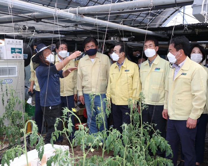 ▲이성희 농협중앙회장(오른쪽 앞줄 세번째), 소병훈 국회 농해수위원장(〃네번째)이 12일 경기 광주시 퇴촌면 토마토 시설하우스 침수피해 현장을 찾아 농업인으로 부터 현장 피해상황을 청취하고 있다. 농협 제공 |