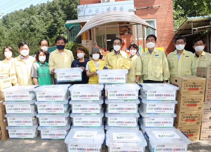 ▲이성희 농협중앙회장(오른쪽에서 다섯번째), 소병훈 국회 농해수위원장(〃여덟번째)이 12일 경기 광주시 우산1리 마을회관을 방문하여 집중호우 피해를 입은 농업인들을 위로하고 긴급구호물품을 전달하고 있다. |