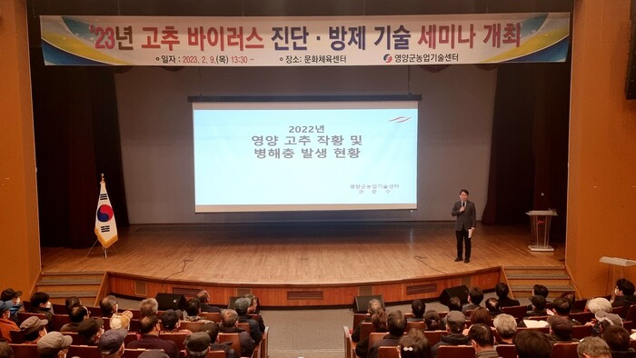 [로컬세계 = 이창재 기자]경북 영양군은 9일 오후 1시 30분 영양군문화체육센터에서 고추농가 300명을 대상으로 안동대 김용균 교수를 비롯한 5명의 전문가로 구성된‘고추바이러스 진단 방제기술’세미나를 개최했다.