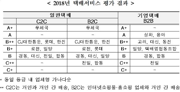 평가 결과, 일반택배 분야에서는 ‘우체국택배’가 A+등급, 기업택배 분야에서는 ‘용마로지스’와 ‘성화기업택배’가 A등급을 받아 서비스 수준이 가장 높은 것으로 나타났다.