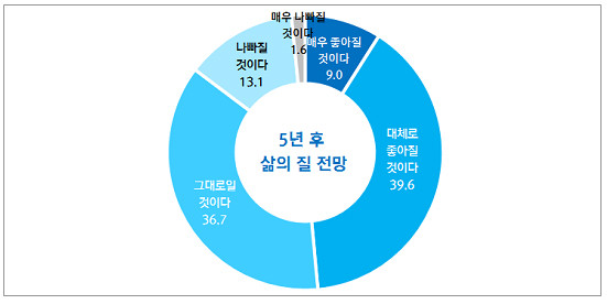 이어 5년 후 삶의 질이 ‘그대로일 것이다’는 응답 비율이 36.7%로 높은 편이었다.