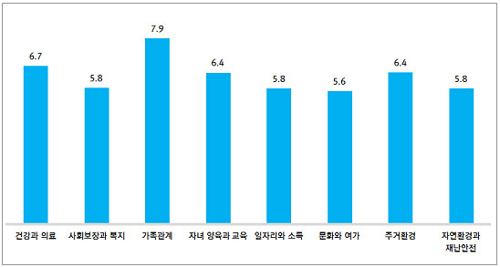 분야별로 삶의 질 만족도가 높은 부문은 ▲가족관계(7.9점) ▲건강·의료(6.7점) ▲자녀양육·교육 ▲주거환경(이상 6.4점) 순이었다. 일자리·소득, 사회보장·복지, 자연환경·재난안전(이상 5.8점), 문화·여가생활(5.6점) 만족도는 평균점을 밑돌았다.