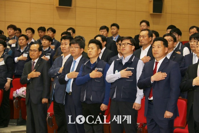 ▲조상언 제8대 한국인삼공사(KGC) 노조위원장 취임식에서 참석자들이 국민의례를 하고 있다. 오영균 기자. |