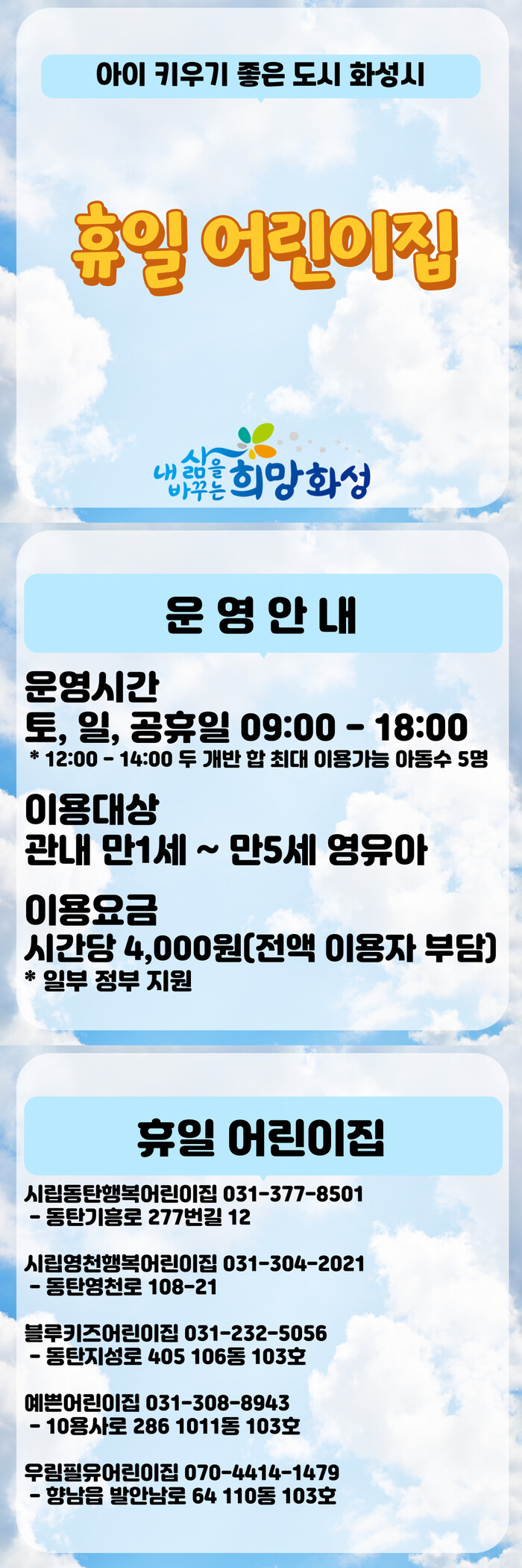 휴일 어린이집은 시립동탄행복어린이집(동탄 6동), 시립영천행복어린이집(동탄 5동), 블루키즈어린이집(진안동), 예쁜어린이집(진안동), 우림필유어린이집(향남읍) 총 5개소에서 이용 가능하다.