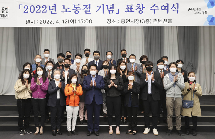 ▲백군기 용인시장은 12일 시청 컨벤션홀에서 근로자의 날을 맞아 유공자 20명에게 표창장을 수여하고 격려했다. 용인시 제공 |