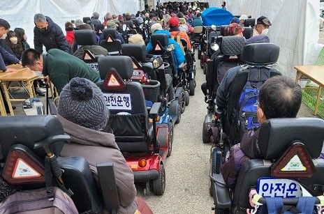 휠체어를 몰고 나온 100여명을 비롯해 지체장애인, 시각장애인, 청각장애인 등 300여명이 모두 마스크를 착용하는 등 방역수칙을 준수하며 사무실 진입로 100여m 구간에 앉은 채 개회를 기다리고 있었다.