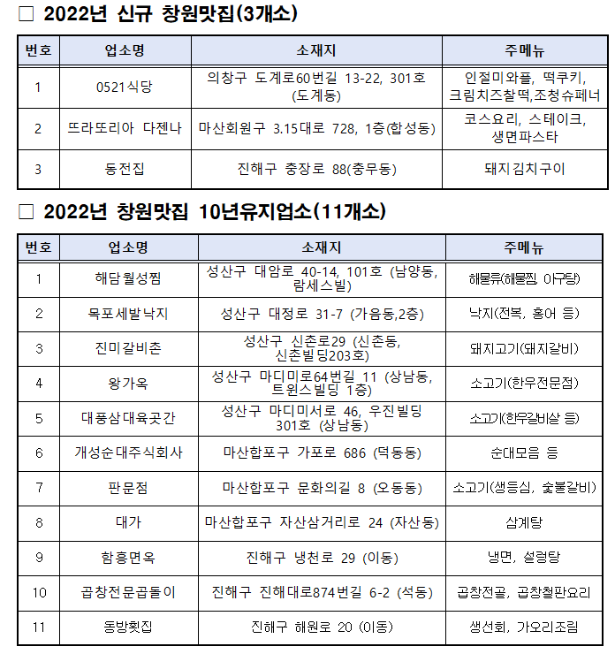 ■2022년 신규 창원맛집 및 10년유지업소 현황