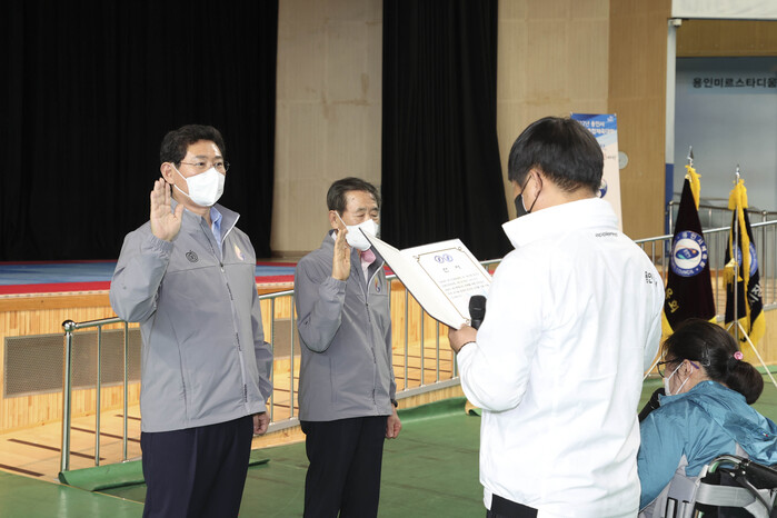 이어 김동준(당구) 선수와 홍미연(보치아) 선수가 용인시 선수단(685명)을 대표해 정정당당하게 승부를 겨룰 것을 다짐하며 선서했다.