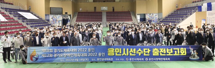 [로컬세계=김병민 기자]경기 용인특례시는 18일 처인구 마평동 용인실내체육관에서 ‘제68회 경기도종합체육대회 2022 용인‘과 ’제12회 경기도장애인종합체육대회 2022 용인‘ 등 2022 경기도종합체육대회 용인시 선수단 출정보고회를 열었다.