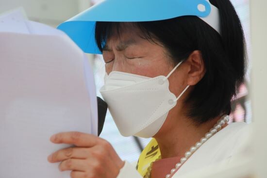 ▲‘재한일본인언론피해대책위’ 소속 4000여명이 18일 오후 서울 광화문광장 모여 ‘일본 현지언론들의 왜곡·편향 보도’를 비판하는 항의집회를 열고 있는 가운데, 부위원장을 맡고 있는 야마다 타에코 씨가 호소문을 낭독하던 중 감정이 북받힌 듯 눈물을 흘리고 있다. 재한일본인언론피해대책위 제공 |