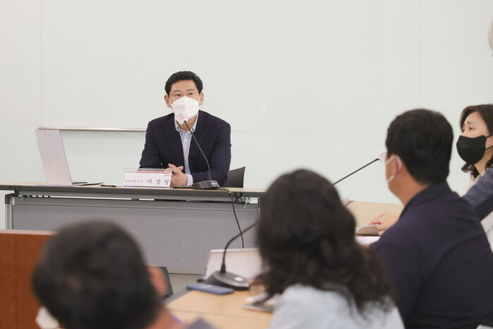 ▲이상일 용인특례시장이 이번 집중호우로 가장 큰 피해를 입은 동천동 주민대표 5명과 피해 복구 상황 등을 논의하고 있다. |