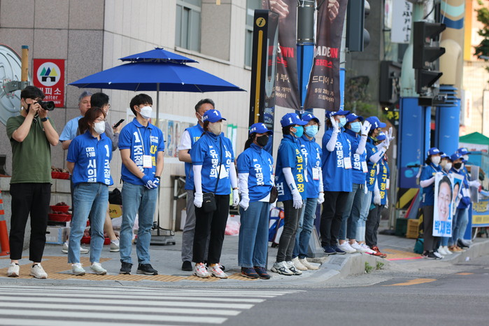 한편, 이날 자리는 선거운동원을 비롯해 지지자까지 모이면서 약 100여명 넘는 인원이 모여 파란 물결을 일으키는 진풍경을 연출했다.