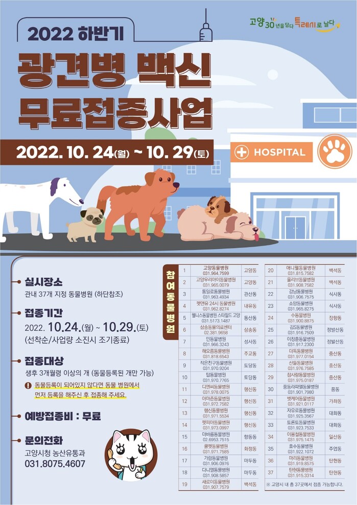 접종을 원하는 시민은 고양시 홈페이지에서 가까운 지정 동물병원 확인 후 방문하면 된다. 백신 소진 시 원래 일정보다 조기 종료될 수 있으니 가급적 빠른 시일 내 방문하는 것을 권장한다.