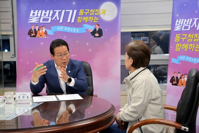 ▲ 김진홍 동구청장과 함께하는 야간 주민소통실을 구청장 집무실에서 구민의 애로사항을 경청하고 있다. 동구청 제공 |