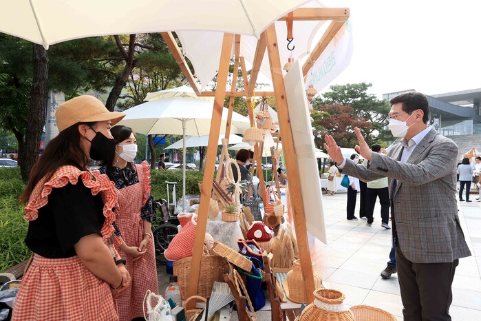 | ▲ 이상일 용인특례시장이 수지아르피아광장에서 열린 '즐겨봐용, 인싸의 숲 용인 청년페스티벌' 행사장을 찾아 행사 관계자들과 인사 나누고 있다. |