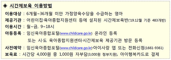 한편 시간제보육반 지정을 희망하는 육아종합지원센터 등 보육 관련 시설은 해당 지방자치단체(시군구)에 신청할 수 있으며, 설치·운영기준 충족 여부를 평가해 내년 1월까지 지정하고 2월부터 운영할 수 있도록 지원할 예정이다.