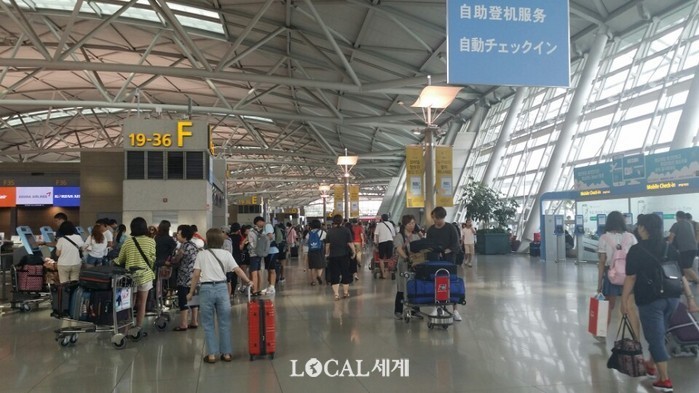 ▲관광객들이 인천공항에서 수화물을 보내기 위해 기다리고 있다. 로컬세계DB |