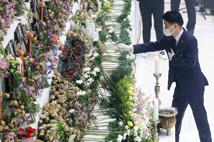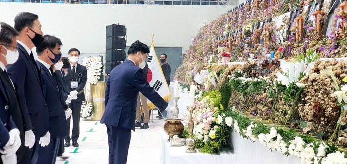 ▲김원기 경기도의회 부의장이 20일 화재 참사 발생 53일만에 이천 서희청소년문화센터에서 열린 ‘이천 한익스프레스 물류창고 화재 희생자 합동 영결식’에 참석해 헌화와 분향을 하고 있다.(경기도의회 제공) |