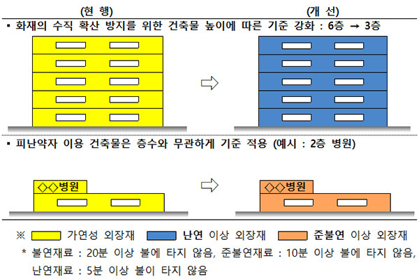 개정안에 따르면 피난에 많은 시간이 걸리는 영유아, 어린이, 청소년, 거동이 불편한 노인, 환자 등 ‘피난약자’와 관련된 건축물은 높이에 상관없이 스티로폼 등 불에 취약한 외부 마감 재료(외벽에 사용하는 단열재나 도장 등 코팅 재료) 사용이 전면 제한된다.