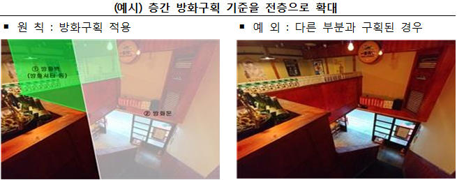 다만, 건축물의 1·2층이 식당 등으로 동일하게 사용하면서 다른 부분으로 화염이 확산되지 않게 구분된 경우에는 층간 방화구획의 적용을 받지 않는다.