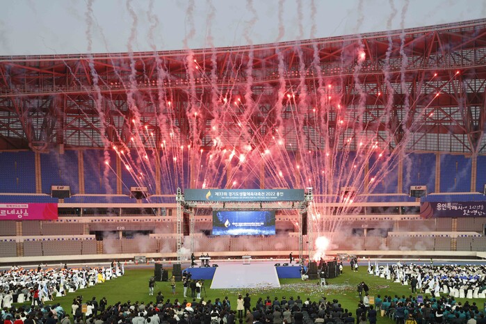 | ▲ 28일 용인미르스타디움에서 '제33회 경기도생활체육대축전 2022용인'의 시작을 알리는 폭죽이 터지고 있다. |