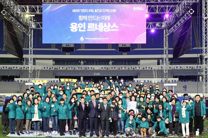 | ▲ 이상일 용인특례시장이 28일 열린 '제33회 경기도생활체육대축전 2022용인' 개회식에서 용인특례시 읍면동 서포터즈 등과 기념촬영을 하고 있다. |