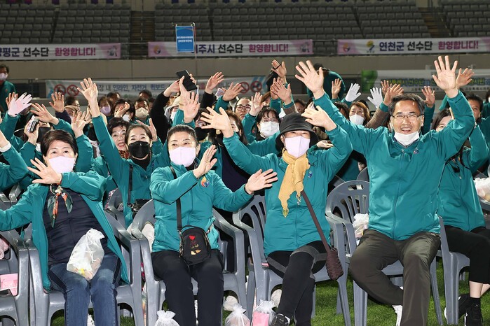| ▲ 28일 용인미르스타디움에서 열린 '제33회 경기도생활체육대축전 2022용인' 개회식에서 용인특례시 읍면동 서포터즈들이 환하게 웃고 있다. |