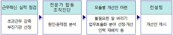 정부는 이러한 근무실태가 업무효율성 저하, 저출산, 과로사 등 많은 사회문제를 유발한다고 판단 ▲업무혁신 및 인력운용 효율화 ▲최상의 근무여건 조성을 위한 복무제도 혁신 ▲초과근무 감축 및 연가활성화 ▲근무혁신 이행확보를 위한 범정부 협업체계 구축 방안을 마련했다.