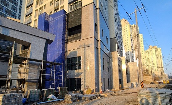▲신축 공사 중인 양우내안애 재개발아파트단지 정문 수영로변에서 바라본 전경. |