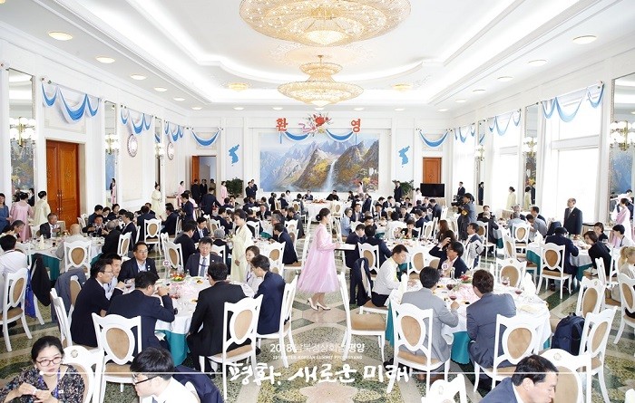 ▲19일 낮 평양 옥류관에서 남북 정상의 오찬이 열리고 있다.(사진=평양사진공동취재단) |