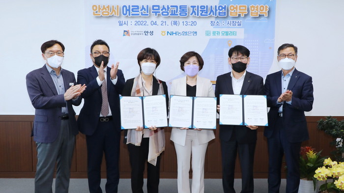 [로컬세계 김병민 기자]경기 안성시는 21일, 65세 이상 어르신을 위한 무상교통 지원사업을 원활히 추진하기 위해 농협은행 안성시지부, 로카모빌리티(주)와 업무협약을 체결했다.