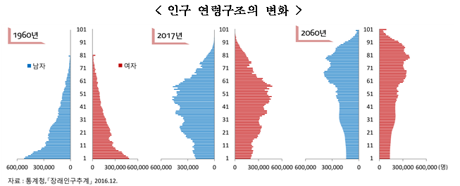▲저출산의 영향으로 출생아수는 계속 감소하고, 의료기술 발달 등으로 인한 수명 연장으로 65세 이상 인구는 계속 증가해 우리나라 인구의 연령구조는 1960년에는 아랫부분이 두터운 형상에서 2017년은 중간 부분이, 2060년에는 윗부분이 두터운 모습으로 점차 전환될 예정임. |