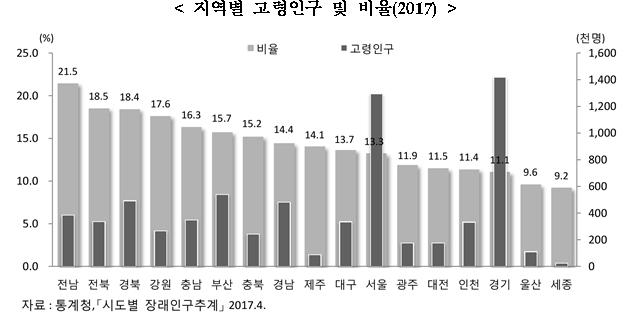 지역별 고령인구 비율은 전남이 21.5%로 가장 높고 전북(18.5%)과 경북(18.4%)도 높은 수준을 나타냈다. 인구 다섯에 하나는 노인이라는 뜻이다. 반면 세종(9.2%)과 울산(9.6%)은 고령인구 비율이 비교적 낮았다.