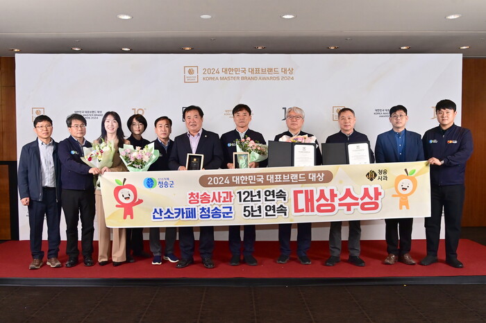 [로컬세계=이창재 기자] 경북 청송군은 17일 서울 신라호텔에서 열린 ‘2024 대한민국 대표브랜드 대상 시상식’에서 '청송사과'가 사과브랜드 부문에서 12년 연속 대상 수상, '산소카페 청송군'이 도시브랜드 부문에서 5년 연속 대상을 수상했다고 밝혔다.