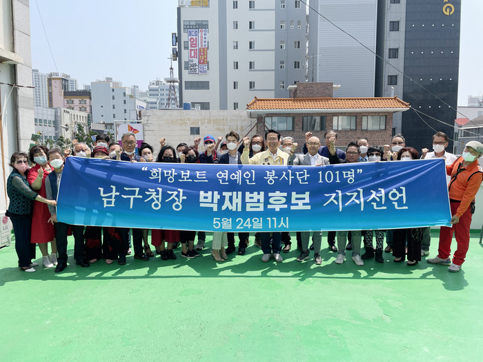 희망보트 연예인 봉사단은 24일 오전 11시 박재범 남구청장 후보 선거캠프를 찾아 지지선언에 나섰다.