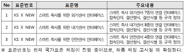이 표준들은 스마트 축사에 활용되는 센서 중 외기센서(7종), 내기센서(8종), 안전센서(4종)의 인터페이스에 대한 기계·전기적 인터페이스 규격 등 정의한다.