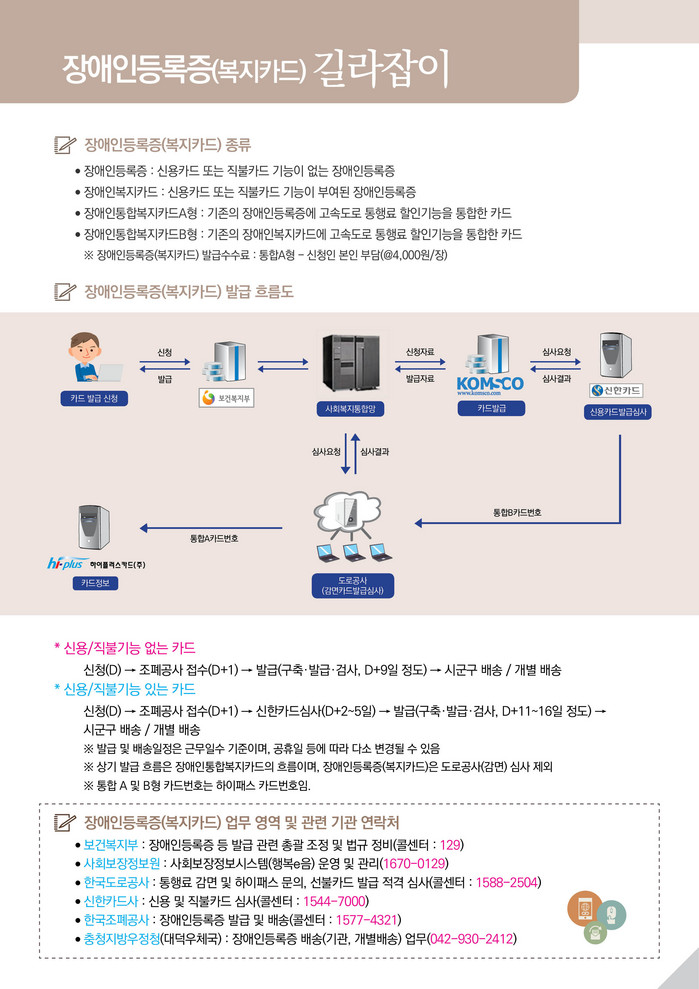 공사에 따르면 ‘복지카드 길라잡이’를 고객용, 주민센터 담당자용으로 별도 제작 배포했으며 올해부터 장애인 복지카드와 청소년증의 발급 기간을 9일 이내로 단축해 고객 편의성을 높였다.
