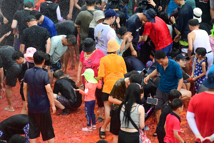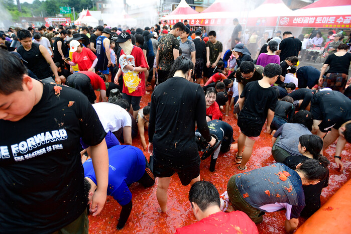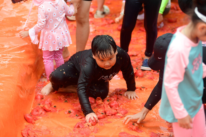 2024 화천토마토축제 이틀쨰인 2일, 사내면 사창리 문화마을에 마련된 축제장에서 관광객들이 '황금반지를 찾아라' 이벤트를 만끽하고 있다.(사진=화천군 제공)