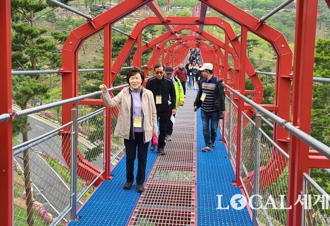 ▲ ‘MG새마을금고 역사관’ 탐방을 끝낸 남부산새마을금고 회원 130여명이 인근 동의보감촌으로 이동, 무릉계곡 위에 설치된 총연장 211m에 달하는 출렁다리(산청 무릉교)를 건너며 관광을 즐기고 있다. |