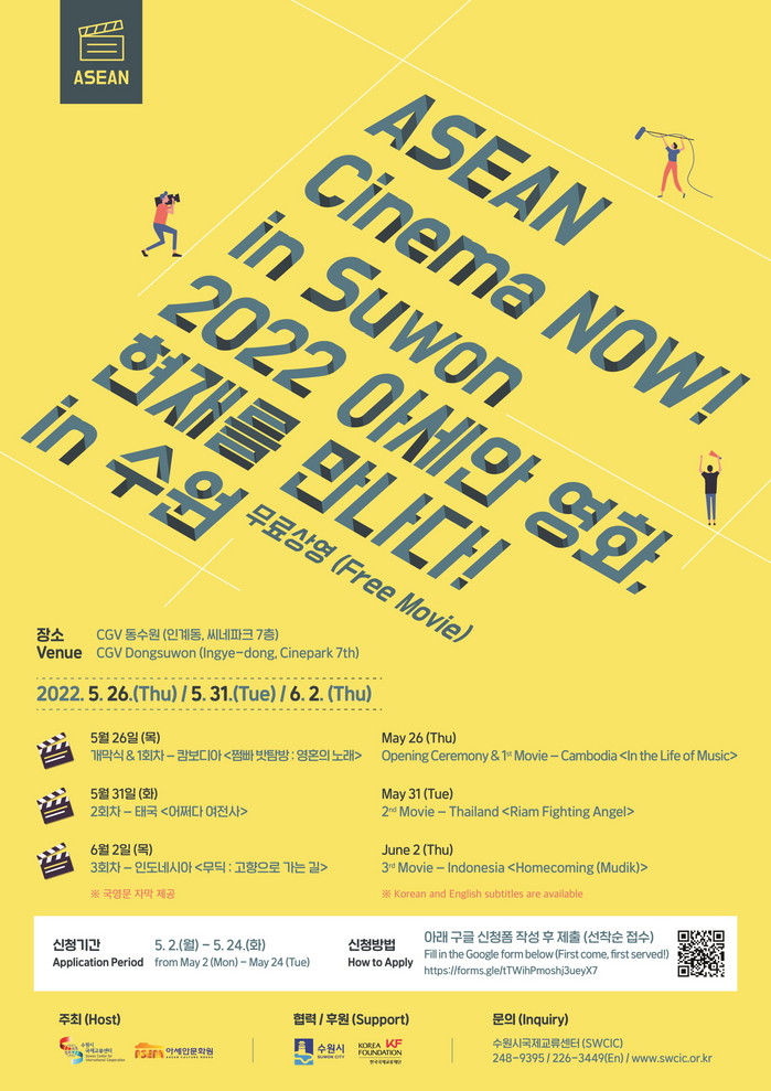 수원시민, 외국인 주민은 누구나 무료로 아세안 영화상영회에 참가할 수 있다. 온라인으로 구글 신청서를 작성해서 제출하면 된다. 영화별로 선착순 70명을 모집한다.
