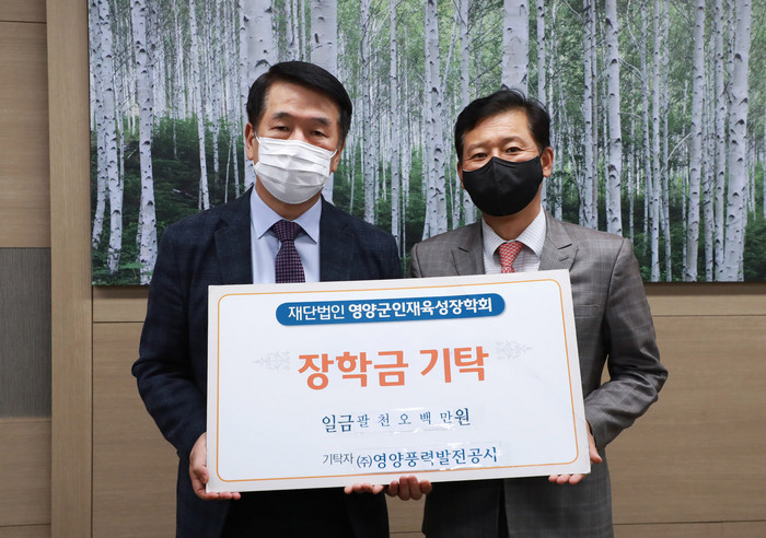 ㈜영양풍력발전공사는 평소 지역사회발전을 위해 장학금 및 불우이웃돕기 성금과 코로나19 극복 물품을 기탁하는 등의 선행으로 모범을 보여왔으며, 특히 이번 장학금의 경우 영양군인재육성장학재단에 대한 단일 기부금으로는 역대 최고금액이다.