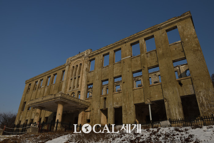 ▲한국전쟁 당시 격전을 벌여 지금까지 총탄의 흔적이 역력한 철원 옛 노동당사의 모습. |