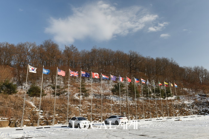 ▲한국전쟁 참전국들의 국기가 바람에 휘날리고 있다. |