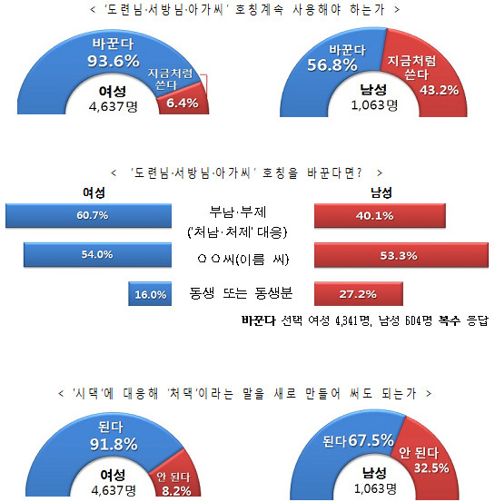 ‘시댁’에 대응해 ‘처댁’이라는 말을 ‘성(性) 대칭적’으로 새로 만들어 써도 되는지 묻는 조사에서는 여성 91.8%, 남성 67.5%가 ‘된다’고 답했다.