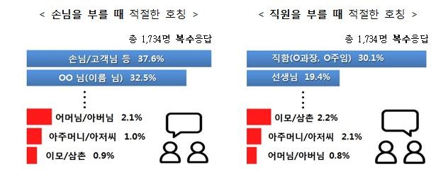 반면 친족어를 사회적 관계에서 이용한 호칭인 ‘어머님·아버님’, ‘이모·삼촌’을 선택한 응답자는 손님과 직원 호칭 각각에서 2%대 이하로 나타나, 손님과 직원 간 호칭으로는 선호되지 않았다.