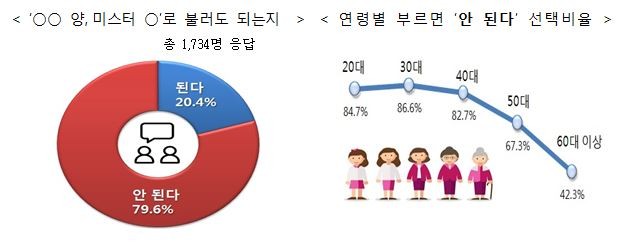 직장에서 쓰는 호칭에 대해서는 ‘○○ 양,○○ 군’, ‘미스 ○, 미스터 ○’로 불러도 되냐는 질문에 참여자들은 ‘안 된다’(79.6%), ‘된다’(20.4%) 순으로 응답했다. 특히 젊은 연령대일수록 ‘안 된다’ 선택 비율이 높았다.