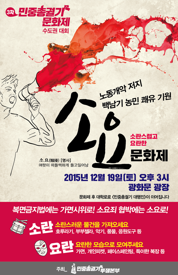 소요 문화제는 민중총궐기 참가자들에게 ‘소요죄’를 적용하려는 정부 방침에 반발하는 의미가 있다고 설명했다.